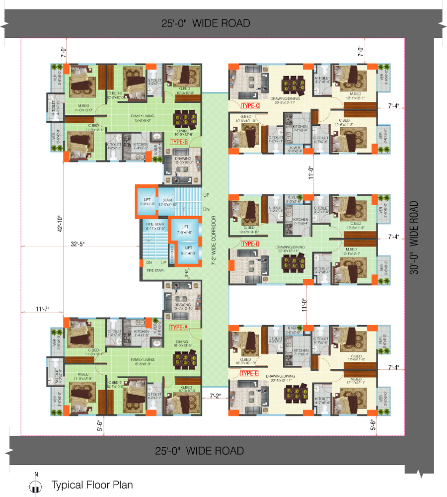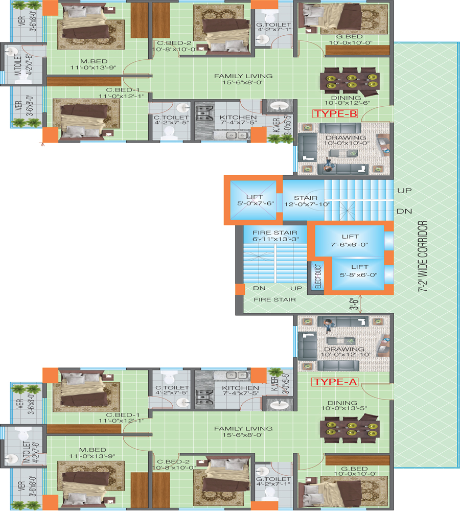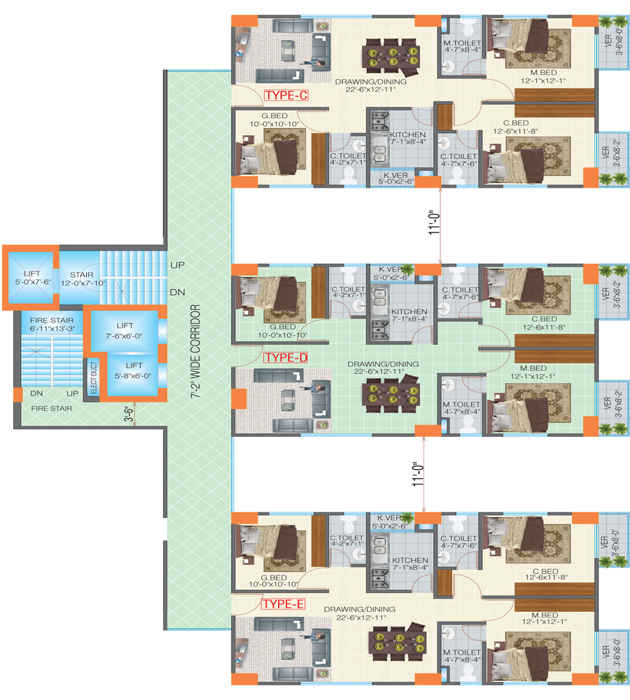 Apartment size: A = 1500 sft. (Apporx) Type- B =1465 sft (Apporx) Type-C = 1350 sft. Type-D = 1350 sft. Type-E = 1350 sft.